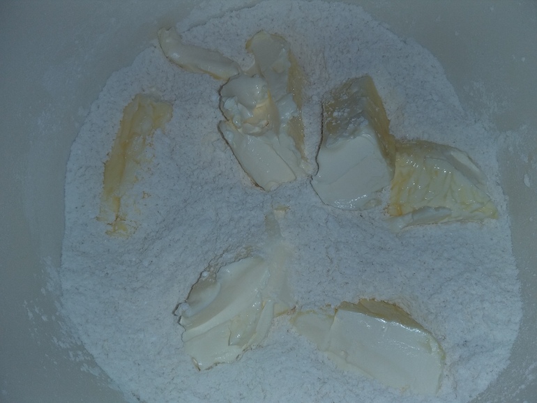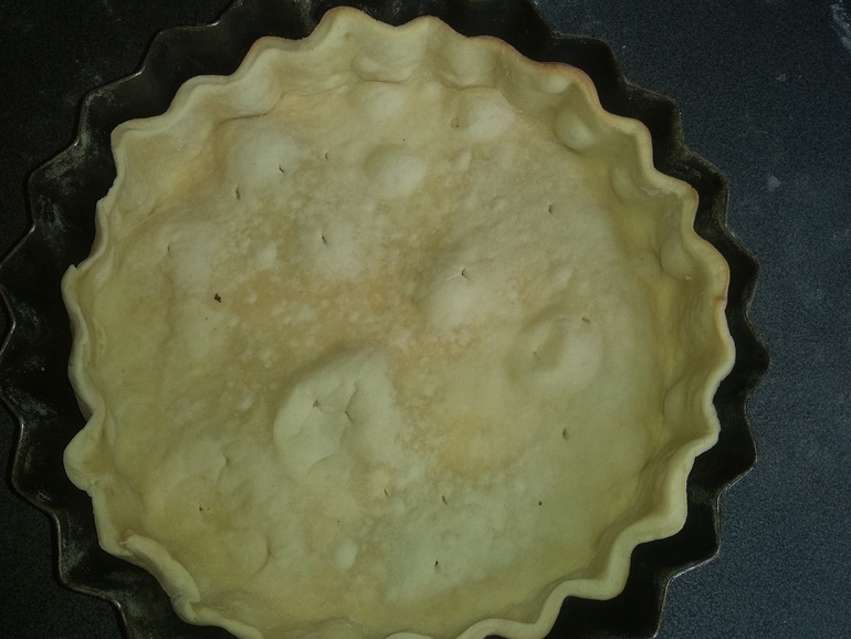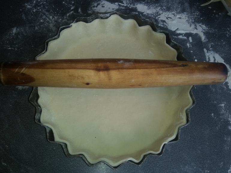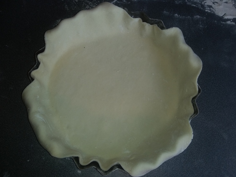Сделать песочное тесто по любимому рецепту. Например, из 1 яйца, 2 ст.л. сметаны, 180 г растопленного маргарина, ч.л. разрыхлителя и муки: