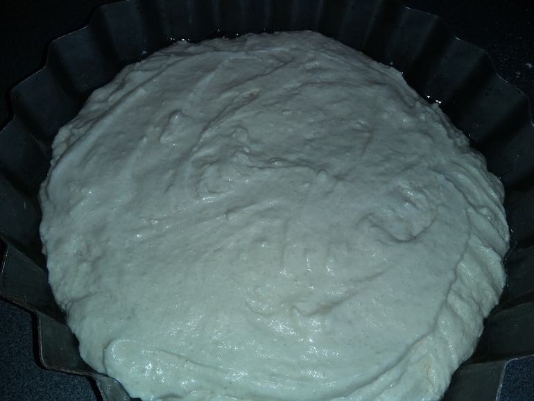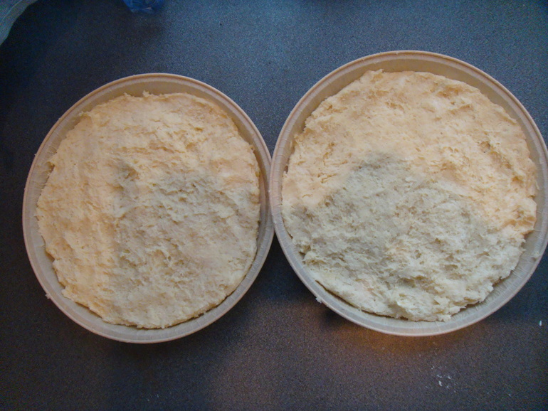 Готовое тесто разделить на 2 части. Каждую часть размять руками по формам (у меня одноразовые бумажные для выпечки):