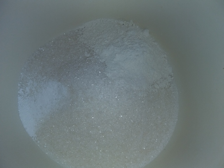Смешать 200 г муки, 200 г сахара, 1 ч.л. разрыхлителя: