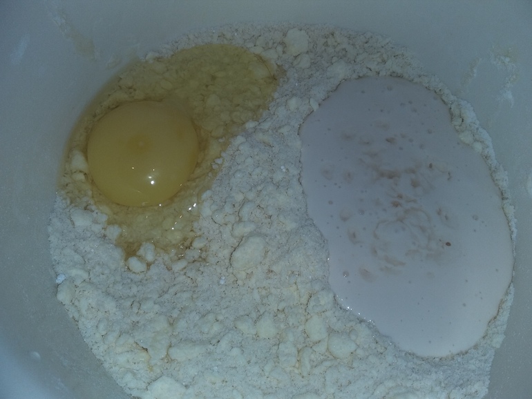 Смешать миксером в крошку. Добавить ванилин, 1 яйцо и 100 мл кефира или сметаны: