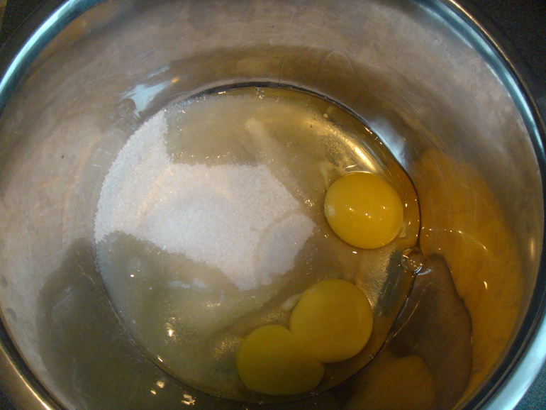 Размешать вилкой 3 яйца со стаканом сахара и ванилином: