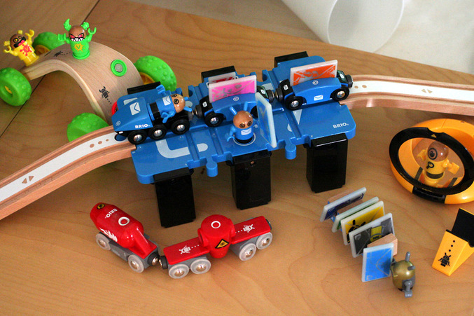 РоманКогда был Рома маленький спочти лысой головой его мама увлеклась деревянными дорогами. Долго собирали, потом Ромка начал играть и испугался поезда на пульте, он издавал очень громкие звуки при торможении и трехлетний мальчик забыл о нем нанесколько месяцев. Но вот любовь опять началась и мы подсели на серию Brio Network. На егодня это самая любимая Ромкина игра.