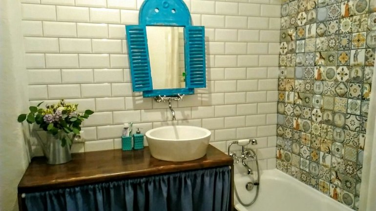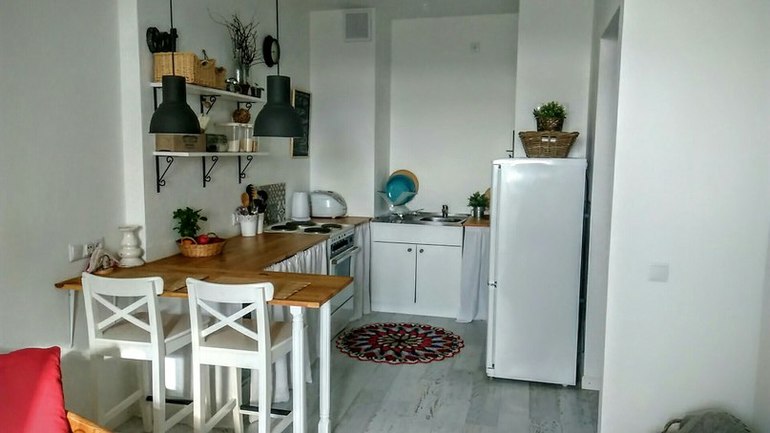 Квартиру строила сама, одна, зарабатывала на нее 10 лет. Проживают 2 человека - я и мой сын. Общая площадь 41 кв.м. (без учета лоджии) - кухня-гостиная 17 м, спальня сына 15 м, прихожая и ванная - по 4,7 м. На ремонт денег было около 5 тыс. долларов (квартира без отделки). 70% ремонта я делала сама, включая самодельную кухню и столешницу в ванной. Все, что я смогла выжать из этого бюджета (учитывая кое-что из мебели и текстиля, имеющихся с прошлой квартиры) - на фото.