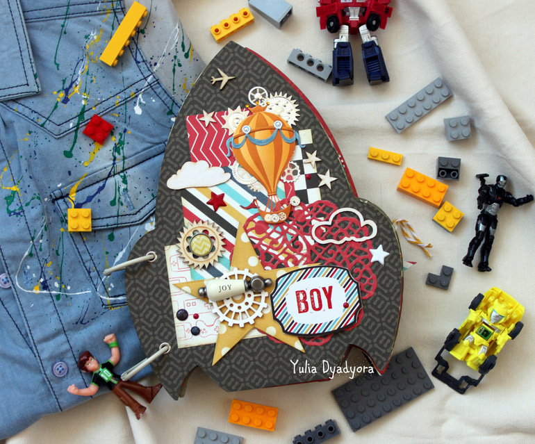 Сегодня я с альбомом в виде ракеты, сделанным на курсах Тани Дудкиной. Он получился ярким, веселым и по-мальчишечьи озорным. Размер примерно 23 на 18 см, рассчитан на небольшие фотографии 7,5 на 10 или 6,5 на 9 см (такие получаются, если на стандартном формате печатать по 2 штуки).