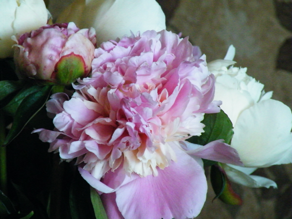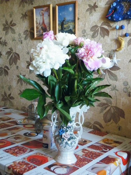 Вообщем вышли мы гулять в 8 утра пришли домой в11,30 я даже мозоли натрла, благо на улице не жарко сегодня всего +21 и ветерок. На подаренные мне деньги (наДР)сходили купила себе аккамуляторов к фотику и букет моих любимых белых и розовых ПИОНОВ. Ах девочки это мои любимы цветы, пришла домой поставила в вазу и сижу в таком благоухании.