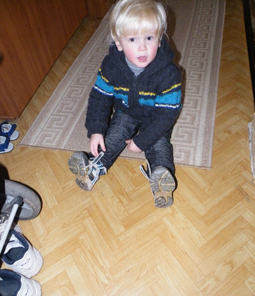 Приходит садиться и снимает обувь, пора купить мини стульчик для этих дел