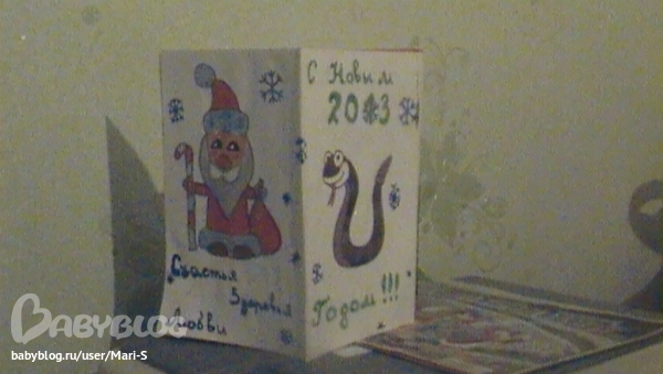 Ёлочку сделала из цветной бумаги, сверху прошлась кисточкой с белой гуашью- типа снег припорошил!!!Конечно малая быстро усекла что мама что-то делала и добавила свои каляки возле ёлочки!!!!