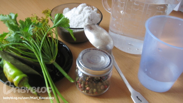 перец горошком, пару лавровых листиков, остальное- кто что любит, у меня петрушка, укропный зонтик и несколько кружочков острого перца