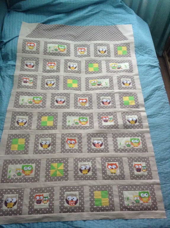У меня страшно сборит, еще наполнитель пушистый очень, я поперек прострочила, а квадраты вокруг сов стегаю руками)