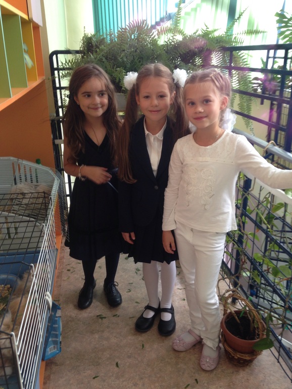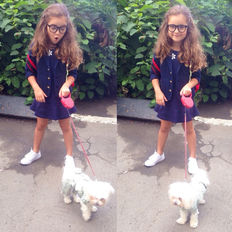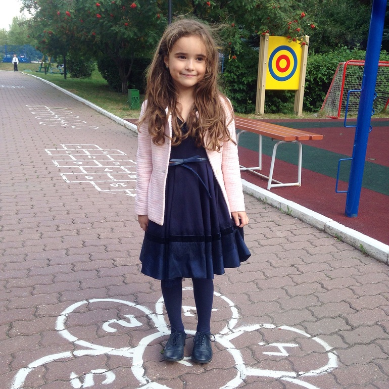 Просила одеть ее максимально по-школьному , что б не выделяться среди первоклашек) Сама она в школу совсем не хочет , говорит : "бедные, беднае дети , еще не знает что им предстоит ..." Будто она знает :)