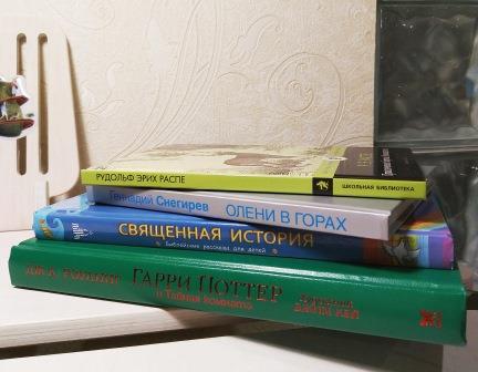 Сын читал не каждый день (как обычно во время учёбы), а когда хотелось, поэтому и случайных книжек не было. В стопке почти все:
