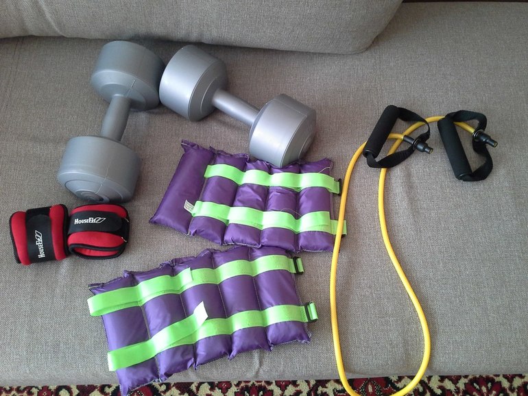 2 утяжелителя на ноги по 2 кг, 2 на руки по 1 кг, эспандер трубчатый, 2 гантели винил по 5 кг!