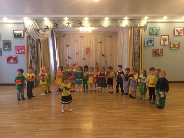 На сцене, тем временем танец с цветочками закончился, Лиза продолжала стоять и любоваться ими, но тут по сценарию надо было вернуть цветы и взяться детям за руки, подошел к Лизе мальчик и забрал цветы, у дочки губы опустились вниз, лицо скривилось, я приготовилась к что еще и ее мне утешать, но она сдержалась. Тем временем новое действо на сцене, дети стоят в кругу,