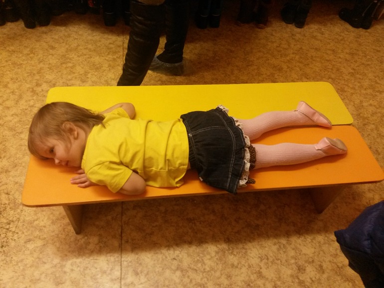 Лиза вышла из круга прилегла на пол, выглядело забавно, если бы не было так грустно. Я окончательно убедилась, что все происходящее она не понимает и не осознает, когда заорала в очередной раз мелкая, мне пришлось выйти, и Лиза увидела мой уход и заплакала. Когда мы вернулись, Лизу на сцене я уже не видела, мне сказали, что она у педагога на руках... так и прошел остаток праздника.