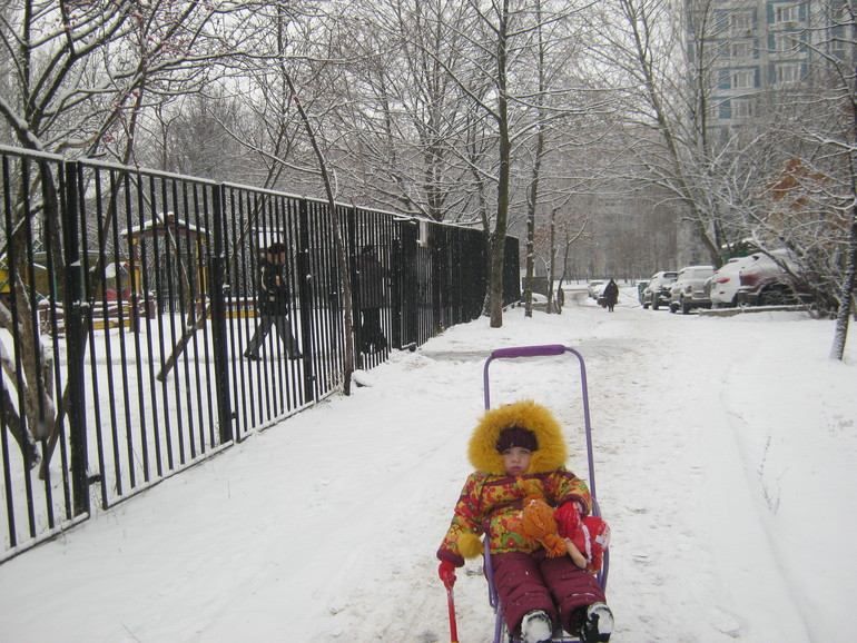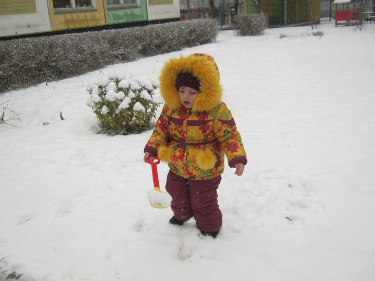 Наконец то выпал снег! А то смотришь на улицу и грустно грязь, сырость, непонятно во что ребёнка одеть, куда гулять пойти! Гдезима? Каждый день Настя спрашивает, "сегодня на санках поедем? Где снег? Мам, сейчас зима? Давай санки гулять возьмем?" наконец выписались, и даже в пятницу сад сходили, в воскресенье в театр .. Сегодня чуть не проспали садик! Но на удачу папашка был дома и напомнил, а в садик идете? На улице снег идёт.." так что раз на работу сегодня мужу к 11 отправила обоих в сад! Ещё и на санках По этому поводу Настя даже изволила позавтракать, а ещё не возражала одеться, видители ей слитники не нравятся, а комбез с курткой, Капризу устраивает! Правда в нём огромная, и неуклюжая (не я выбирала, свекры подарили ещё года полтора- два назад но хорош, тёпл и детю нравится. ) вот вчера в нём в театр, сегодня в сад и гулять.