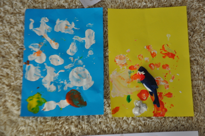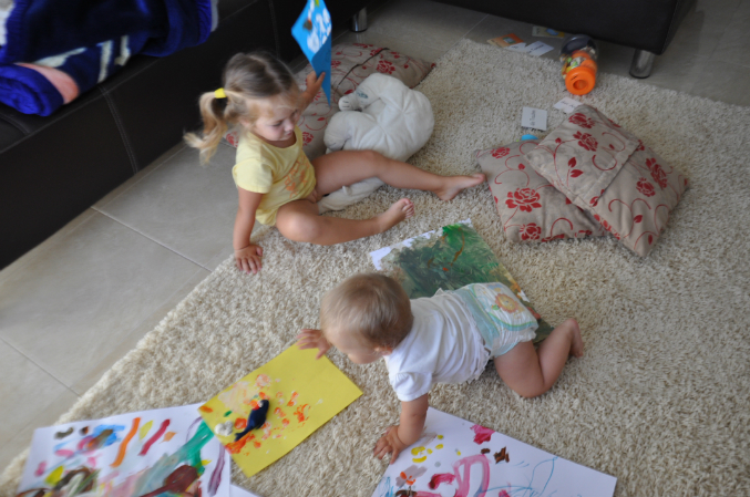 Недавно, месяц назад, я купила ей другие краски и бумагу А3 формата хорошую плотную. Девчата, мне нравится. Я перестала ее просить нарисовать что то. Она подходит к столу (на которм я иногда таки прибираюсь) и начинает творить. Часто раскрашивает камушки, некоторые игрушки. Полностью выкрасила два стула (еле отмыла). Цвета перемешивает сама. Цветную бумагу достала сама и сама выбрала цвета: белый на голубом листе, оранж на желтом.