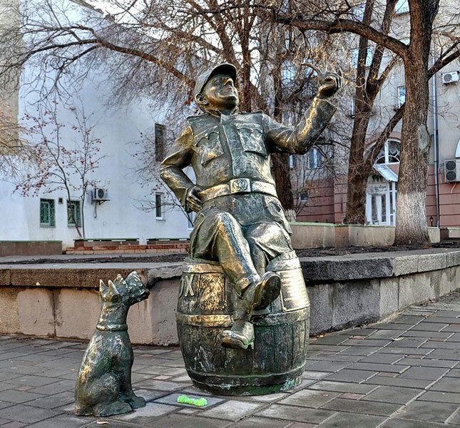 А на перекрестке улиц Куйбышева и Некрасовской на бочке сидит бравый солдат Швейк в натуральную величину.
