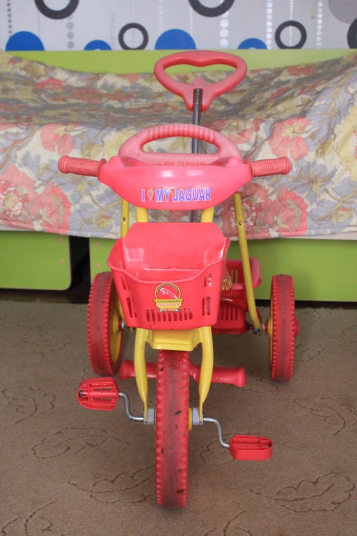 Красный. Состояние хорошее, но родительская ручка не регулируется, закреплена болтом. И утерян гудок, был в виде игрушки пингвина. Цвет выцвел