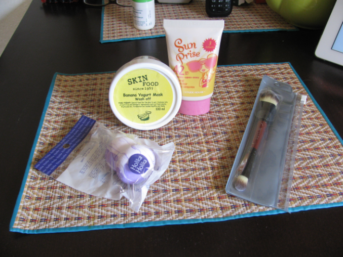 SKINFOOD Banana Yogurt Mask Wash Off, ETUDE HOUSE Sun Prise Natural Corrector, Двойная кисть для консилера и тональной основы, Спонж для нанесения бб-крема полосатый