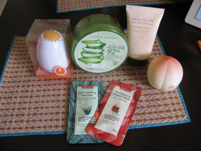 Tonymoly Egg Pore Blackhead Out Oil gel, Tonymoly Peach anti-aging hand cream, MISSHA Moist 24 Hand Cream - Manuka Honey, Nature Republic Soothing & Moisture Aloe Vera 92% Soothing Gel, + маски с алое и клубникой
