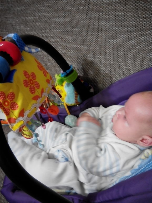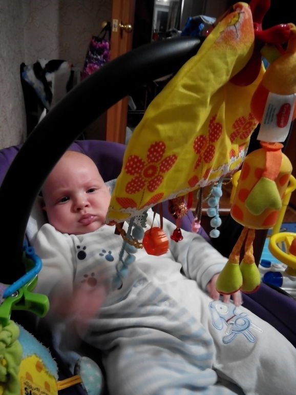 Внутри доп погремушка. Вове эта штука тож понравилась, таскает висюльки рассматривает перебирает)
