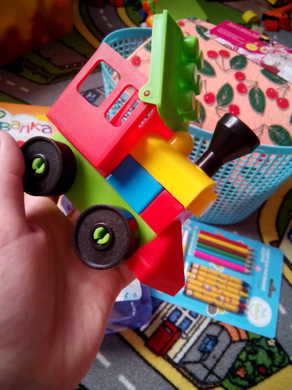 Потом паровозик конструктор, детали крупные, внутри можно посадить зверушку и возить, а сегодня докупила вагончик, можно и ещё один купить потом...
