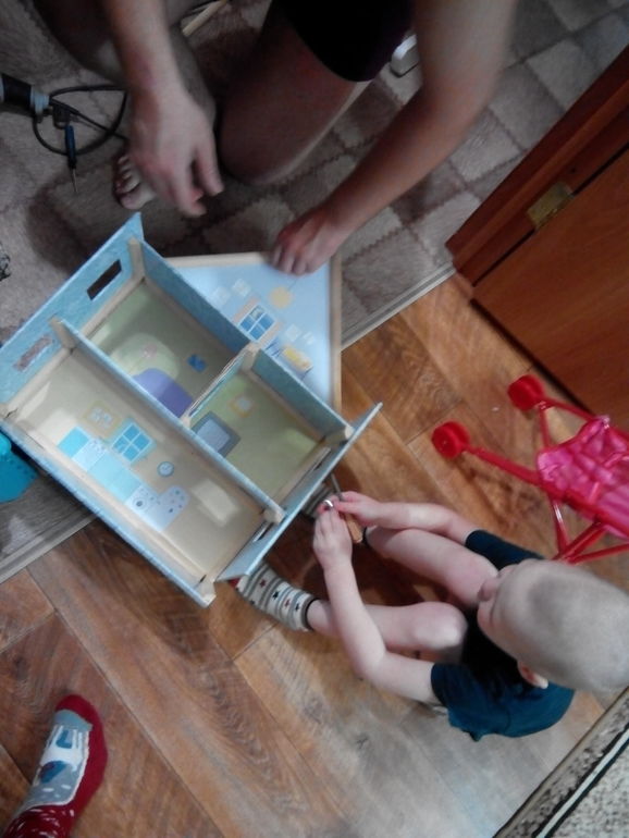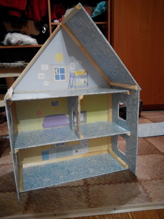 Муж доделал кукольный домик! Дети в восторге. Я даже подсветку сделала. Домик из фанеры. Я его просто обклеила.