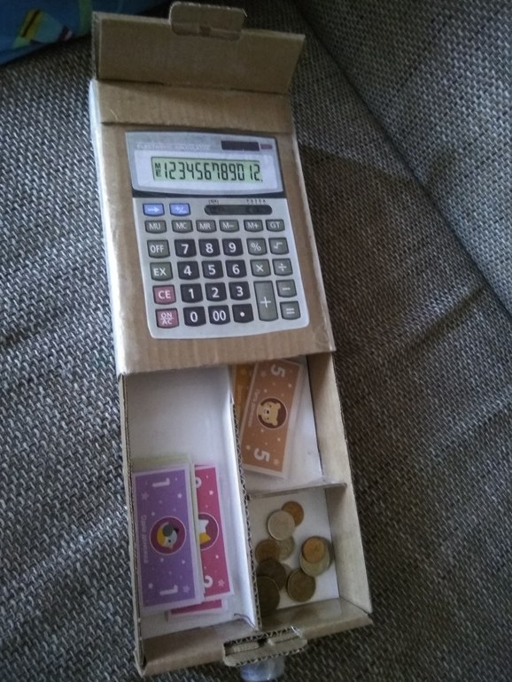 Надеюсь оценит и сразу не разломает. Усилила скотчем. Денюжки распечатала нарезала, монетки стало лень вырезать.