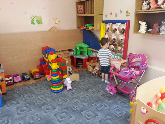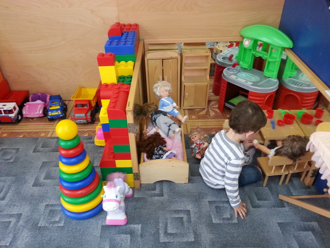 Когда вошли в игровую комнату, Саша первым делом уложил куклу спать в конверт, покачал. Потом пошел гладить одежду и затем устроил чаепитие для кукол. После этого пошел к плите, что-то приготовил в сковородке и только потом уже к машинам и всяким развивалкам =))