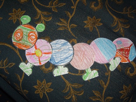 На листе А4 нарисованы круги (6 штук), ноги и рожки - ребенок все это разукрашивает как хочет, а потом вырезаем и степлером соединяем гусеничку)