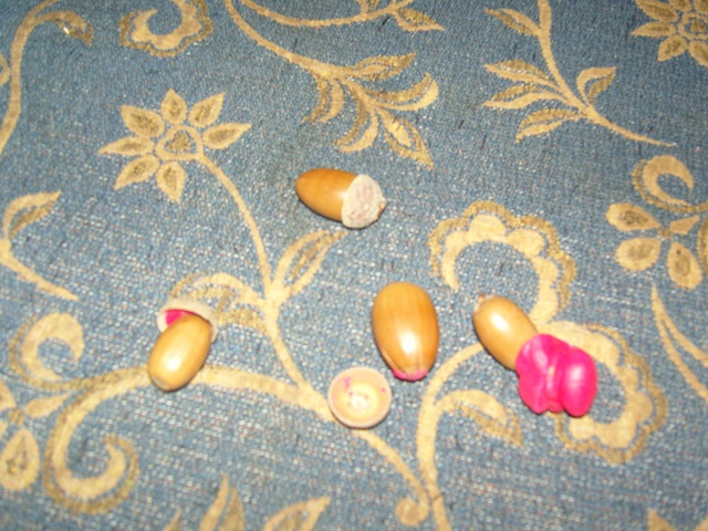 подбирали шапочки по размеру, прилепляли на пластилин а потом дочка слепила что-то) Не поняла что это - но глаза у этого появились)))