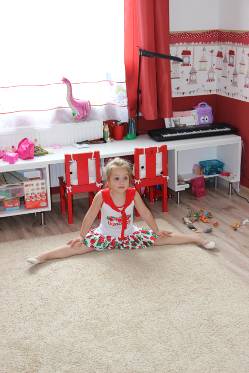 По нормативам: то что на растяжку и упражнения типа отжимания, кувырок etc. она делала лучше всех (ну правда), а вот то, что касается моторики и навыков (складывание скакалки, стойка на голове/руках, прыжки через скакалку etc. - дается с трудом. Про обруч вообще молчу;) Но это дело наживное!
