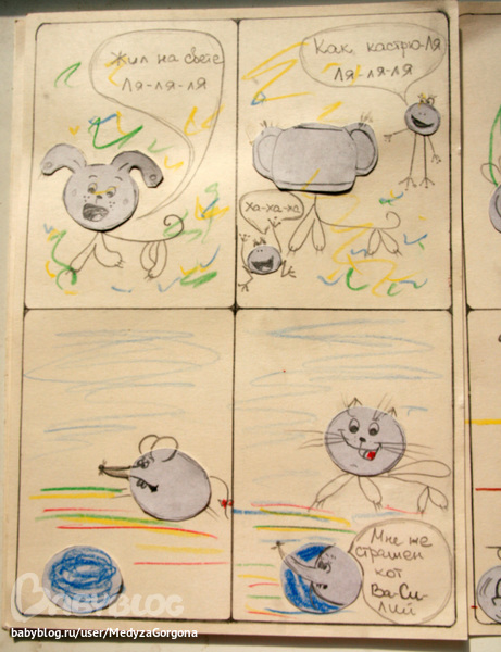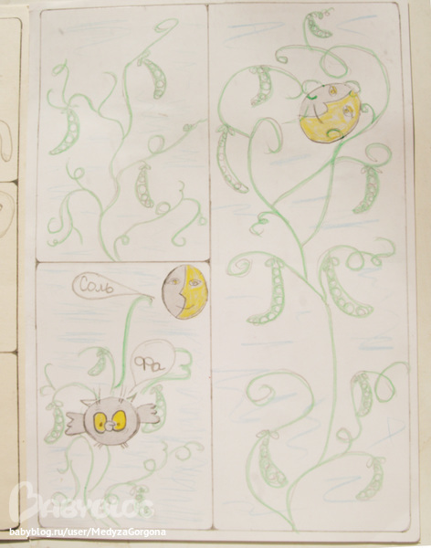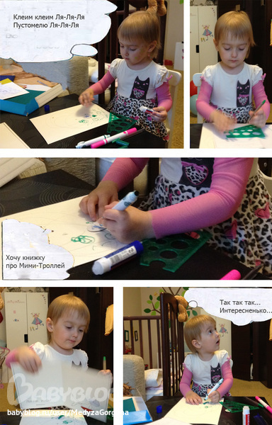 Так как я рисую не лучше своей трехлетней дочери, то комикс для конкурса решили сделать с элементами аппликации по мотивам любимого мультфильма. Я нарезала заготовок, а Алина клеила и расклашивала фон. Усидчивость у нас пока не развита, поэтому работа шла ооочень медленно, чтобы не надоесть и доставить удовольствие. Правда доче больше нравилось разукрашивать приготовленные овальчики и клеить их на стену. Идея сделать комикс на стене, конечно, отличная, но вредная мама обои пожалела. Для начала комикс о том как Алина работает над комиксом: