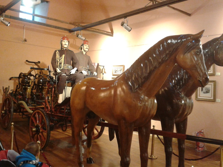 сам по себе музейчик не большой, всего 2 комнаты. пожарных машин там нет. есть кареты, первые тушительные преспособления, манекены в одежде пожарных, каски, медали оружие, фонари и что то еще, чего я не увидела изза моих непосед :) по той же причине всего одно фото получилось сделать, зато с главным экспонатом :)