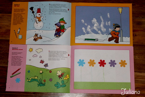 Также от "Мозаики-Синтез".Что сказать.За такую цену возможно они имеют место быть, но за заявленное на оборотной стороне обложки привитие эстетического вкуса я очень сомневаюсь.Идеи где-то неплохие,например,идею с рисованием отпечатками кубиков, которая так сейчас популярна, взяли оттуда,но исполнение на твердую 3.Только из-за кошмарнейших иллюстраций.Все ужасно пестрое,какое-то мракобесие просто.Вспомнились мне сразу "Семь гномов".Нет,мне их не забыть...