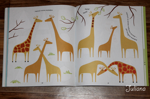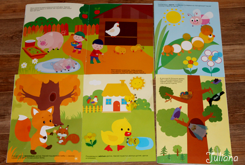 Особенно,для малышей совсем.Открывая книгу,Вы должны испытывать радость, воодушевление. Никакой пестроты. Цвета в приглушенных тонах, плюс тщательно подобраны друг к другу на развороте.Почти все на белом фоне, что тоже хорошо.