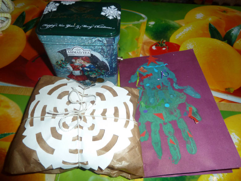 Чай в музыкальной коробке-шкатулке, пакетик с моими разными печеньками новогодними и открытка от Кости.