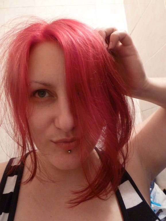 Слегка светлее стал, но все равно фигня...Бледно-розовый у меня по-любому бы не получился, а теперь и ярко не получится... Девченки с работы советуют уже синим добивать.. Вероятно получится фиолетовый, но не факт с такой полосатостью...