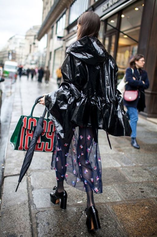 Если в планах поход в театр, ресторан, выход в "свет", дождевик сочетаем с платьем + клатч или сумочку небольшого размера. Образ готов! Сочетание несочетаемого, вот главное, что нужно понимать. Не бояться экспериментировать.