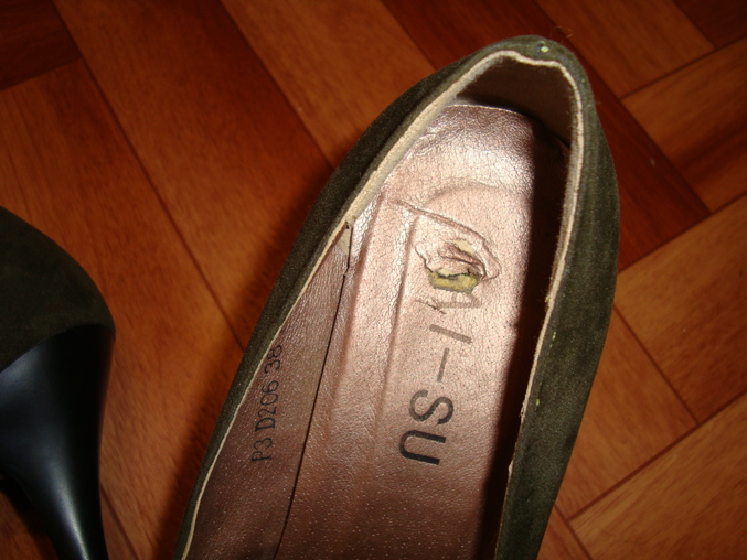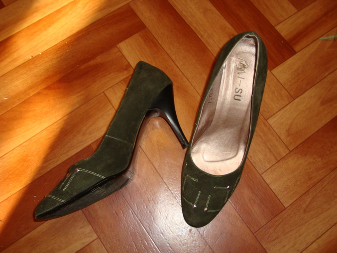 Туфли зелёные 38 размера, одевали их раза 2, НО, кто то на них каблуком наступил и проделал дырку.. а так внешне никаких нареканий нету больше.