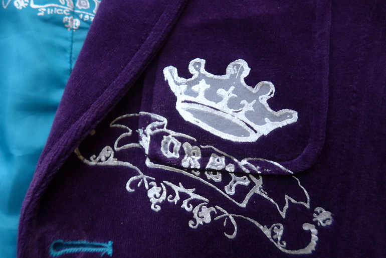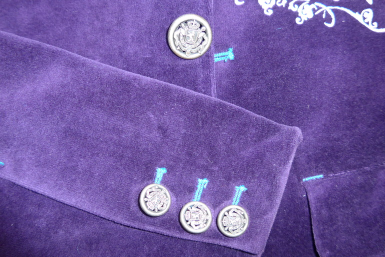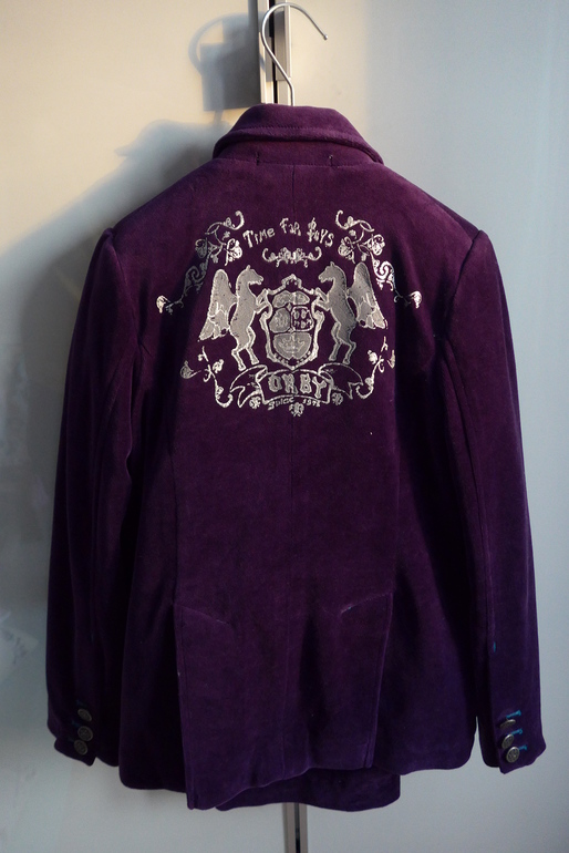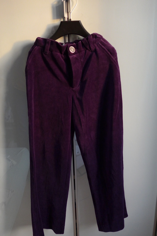 Стильный костюм для молодого человека р.128 - 134 (бренд Orbi), состояние новой вещи, цвет тёмно фиолетовый, пиджак и брюки бархатные, принт на спине, брюках, кармане и подкладке - герб, оригинальные пуговицы. На ребенке смотрится бесподобно