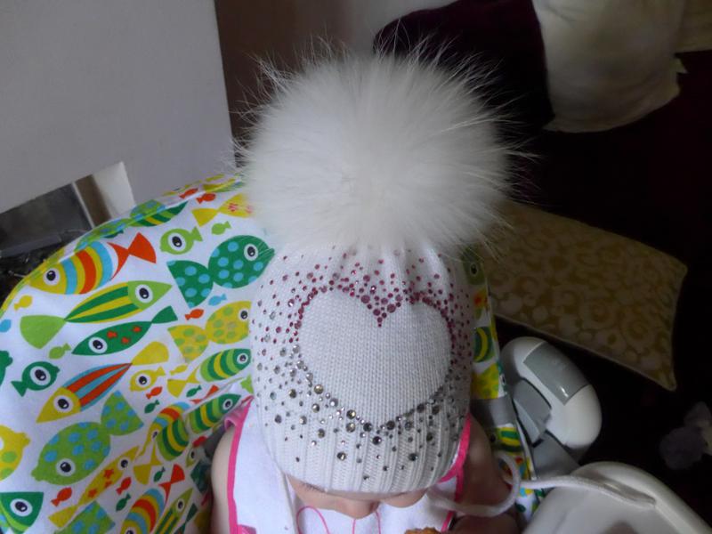 К комбинезону могу предложить шапочку ручной работы,двойная (100% шерсть мериноса) очень теплая - на самые морозы, нежная пряжа - не колется, идеальная моделька - изумительно сидит на головке, стразы Сваровски (оригинал) сверкают и переливаются, шикарный помпон. Подойдет на объем до 50 см.
