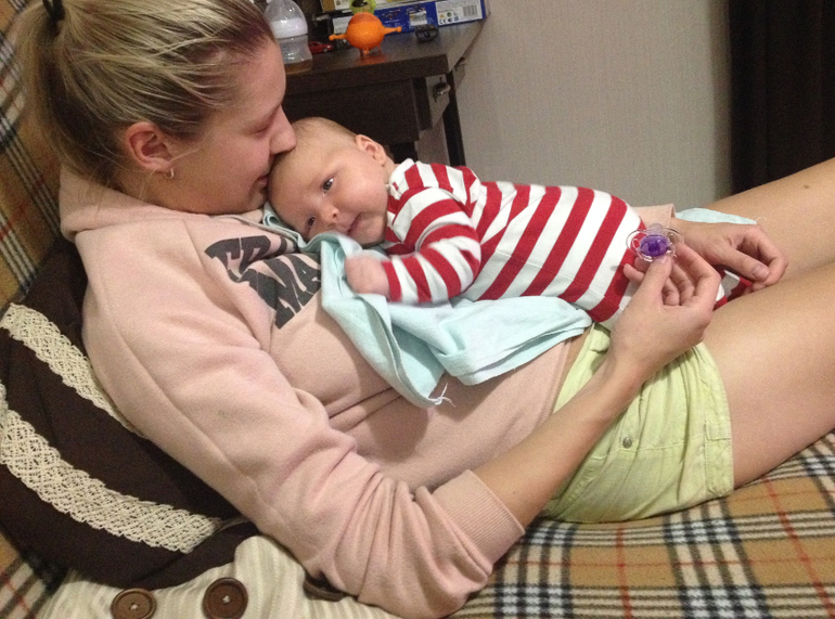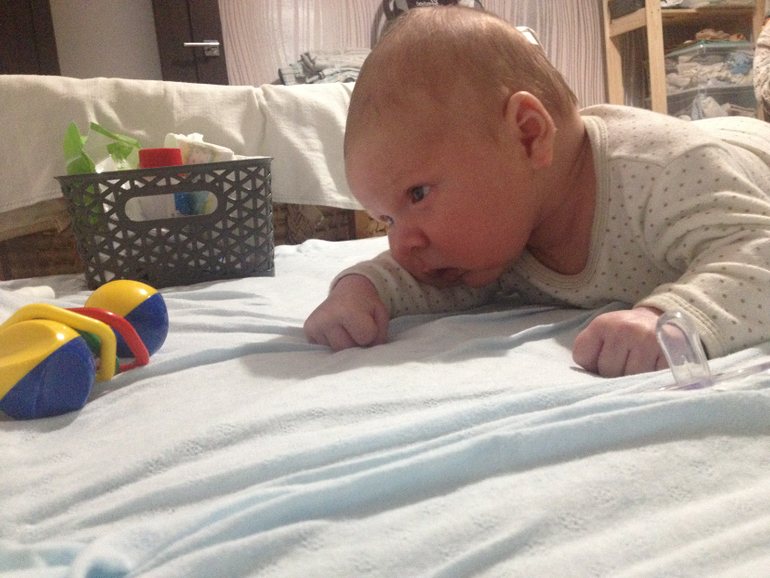 Старается держать головушку. Руки - хорошие, ножки в небольшом тонусе. Глазки смотрят, следят, голову поворачивает, если отводить предмет. Иногда, кажется, соску достает... с явным пониманием - "не надо мне оно!".