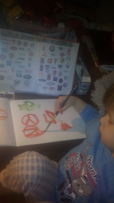 Параллельно с речью стали делать активно упор на развитие моторики рук. Заинтересовала рисованием значков авто. Умеет сносно рисовать значек Ауди, Ситроен, z у Опель, нечто напоминающее Рено) плюс завис на выполнении рисунка по аналогии. Я нарисовала, стал водить пальчиком, повторять рисунок, потом я начинаю его рукой, он продолжает. Качество фото плохое, тк очень долго не сидит, постоянно требует моё участие.