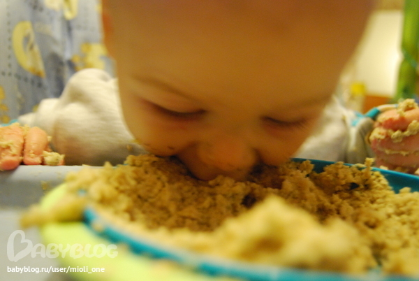 ))))Пятое фото еле получилось. Каждый раз когда он погружал свою мордашку в кашу фотоаппарат отказывался фокусироваться и это единственный кадр получился)