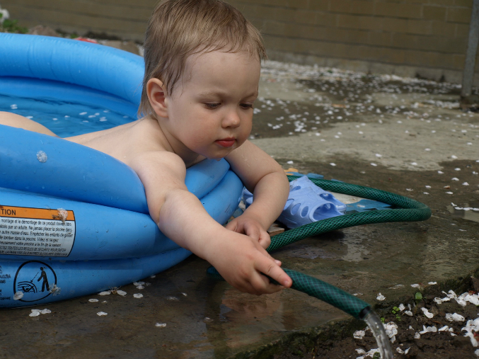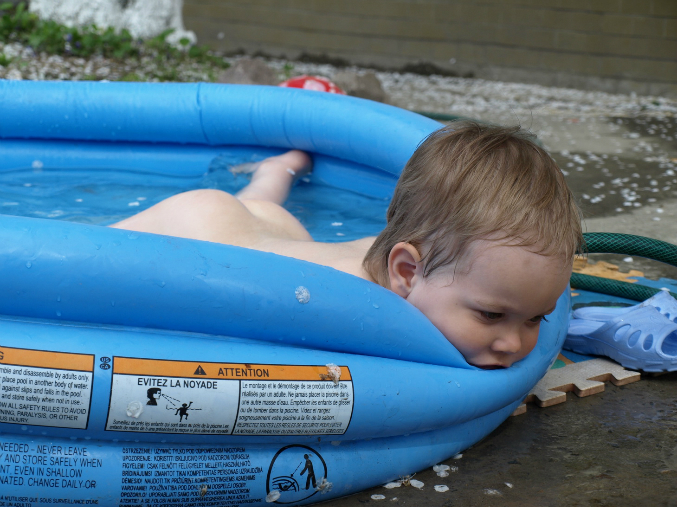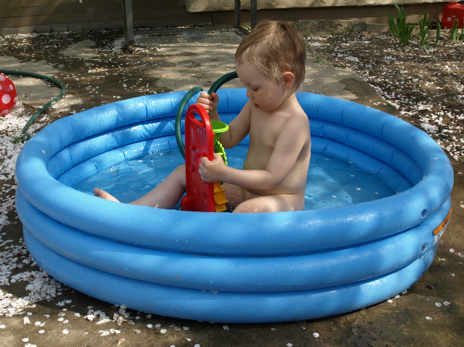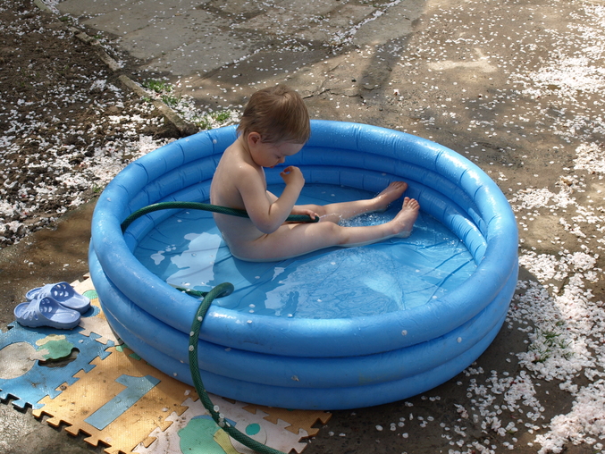 Позавчера у нас было очень жарко(+28 в тени) и Ванюха заставил меня вытащить бассейн и набрать воды теплой) Так что мы уже открыли "пляжный" сезон)))