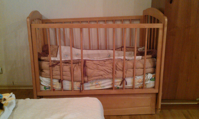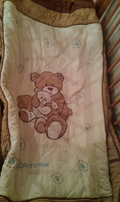 Продается кровать цвета натурального дерева (фирму не помню, но российская) с матрасом, бортиками, одеялом, подушкой и двумя комплектами белья в мишках.