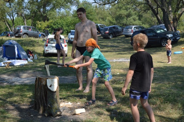 Все мальчишки от 6 лет и старше рубили дрова, самозабвенно и долго) Им это не надоедало, кажется) Правда, пытались спалить при этом бумагу, привезенную для рисования, увещеваний не слушали при этом, чем жутко меня раздражали.