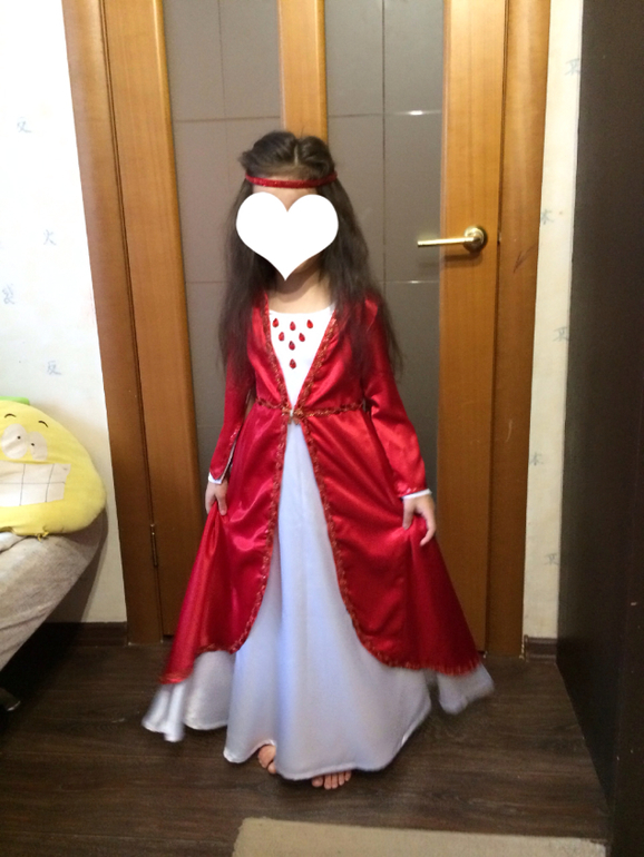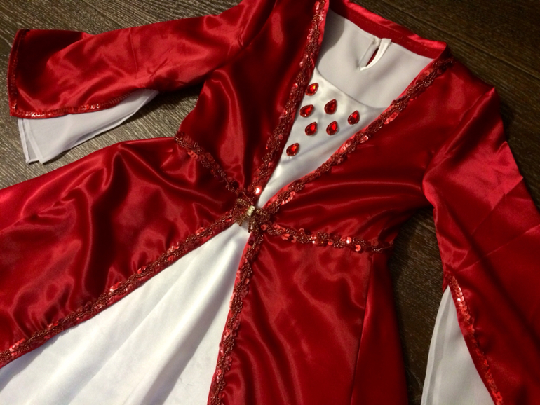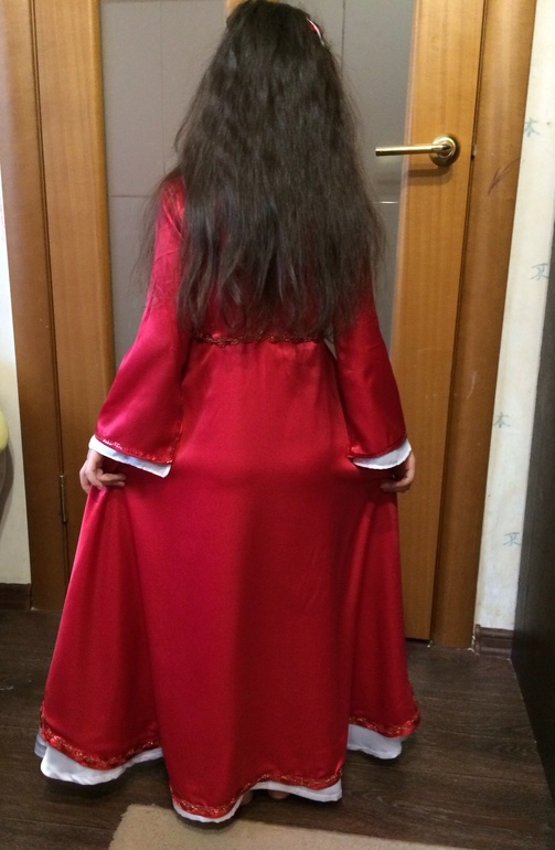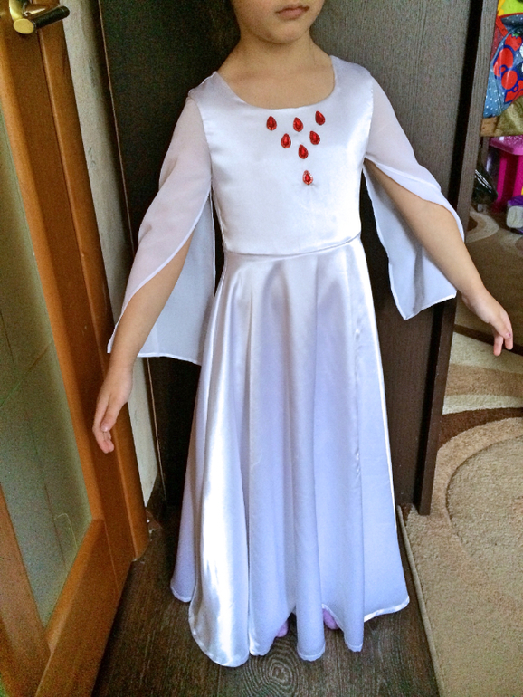 Как и любой мой экспромт- кроила на глаз и интуитивно. Костюм состоит из белого платья в пол атлас-шелк с шифоновыми рукавами- от проймы без шва. Подклад тоже полностью шифон. Горловину украсила пришивными стразами, в виде капелек. И красного кафтана( как я его называю), также из атлас-шелка. Расшила его по периметру и талии тесьмой с люрексом и пайетками, концы рукавов - просто пайетками. У рукавов от проймы небольшой шов, но в остальном свободно, чтоб был эффект расклешенности рукавов.