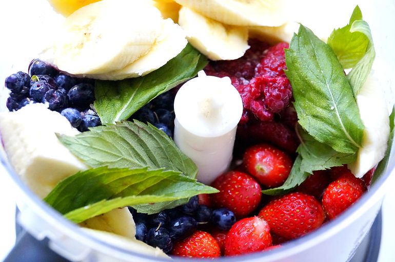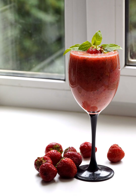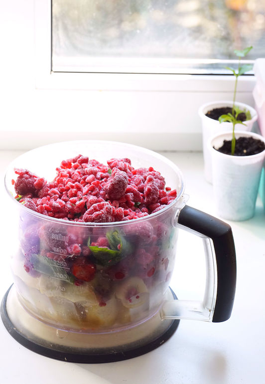 Смешиваем банан, любые ягоды, мяту, фрукты, воду и вперёд! Пьют только так. А какой же это приятный напиток и еда одновременно, если ягоды заранее чуть заморозить!